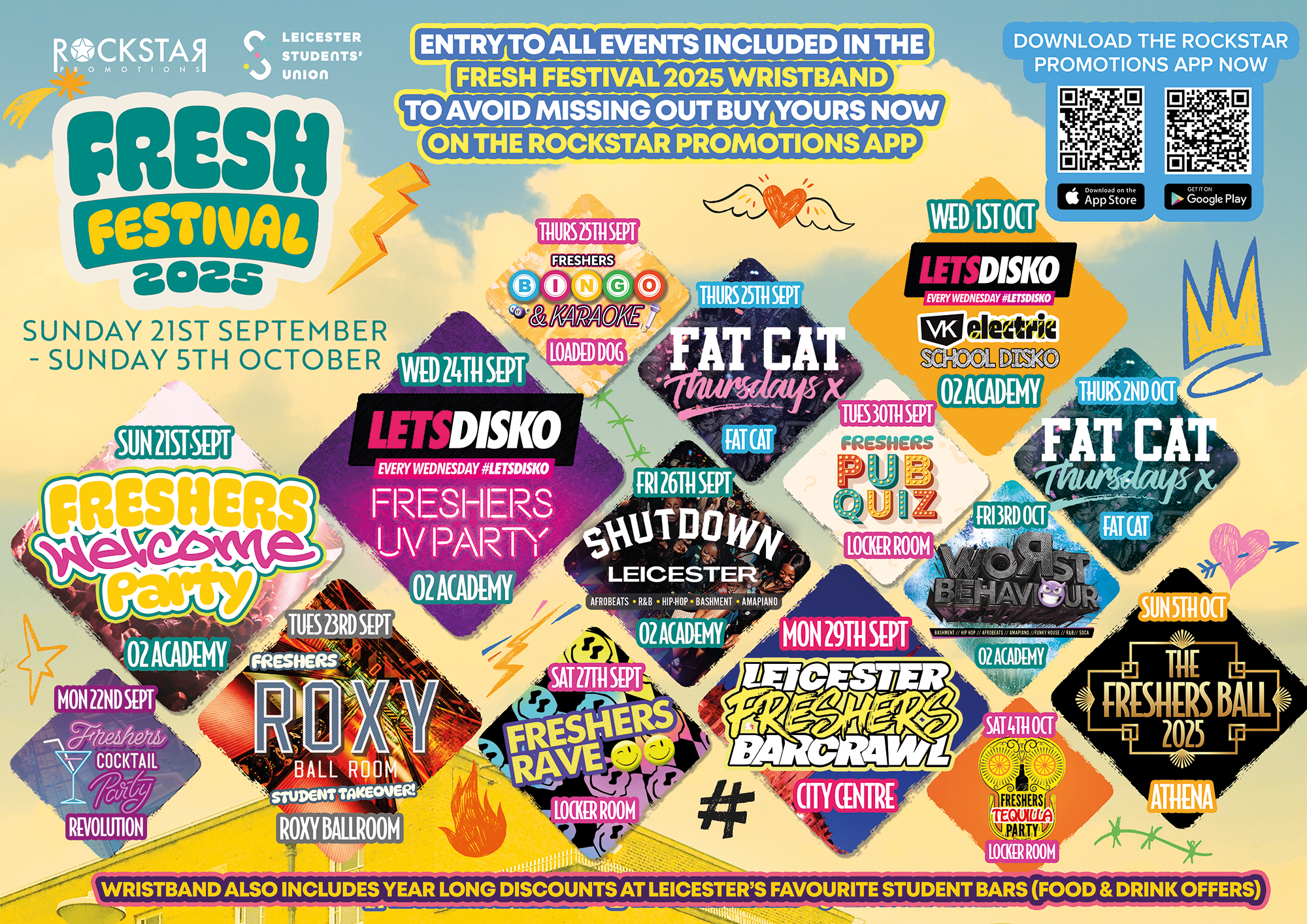 IMPORTANT, please note... No official event wristbands or tickets will be on sale before Friday 22nd August, or from anywhere other than the Rockstar Promotions app, so please always check for the Students' Union logo on any event marketing to ensure it's one of your official events! Be aware that lots of companies try to sell unofficial freshers tickets/wristbands at this time of year, so avoid clicking links in any unsolicited communication such as text messages! If you see any others, please report this to su-marketing@le.ac.uk