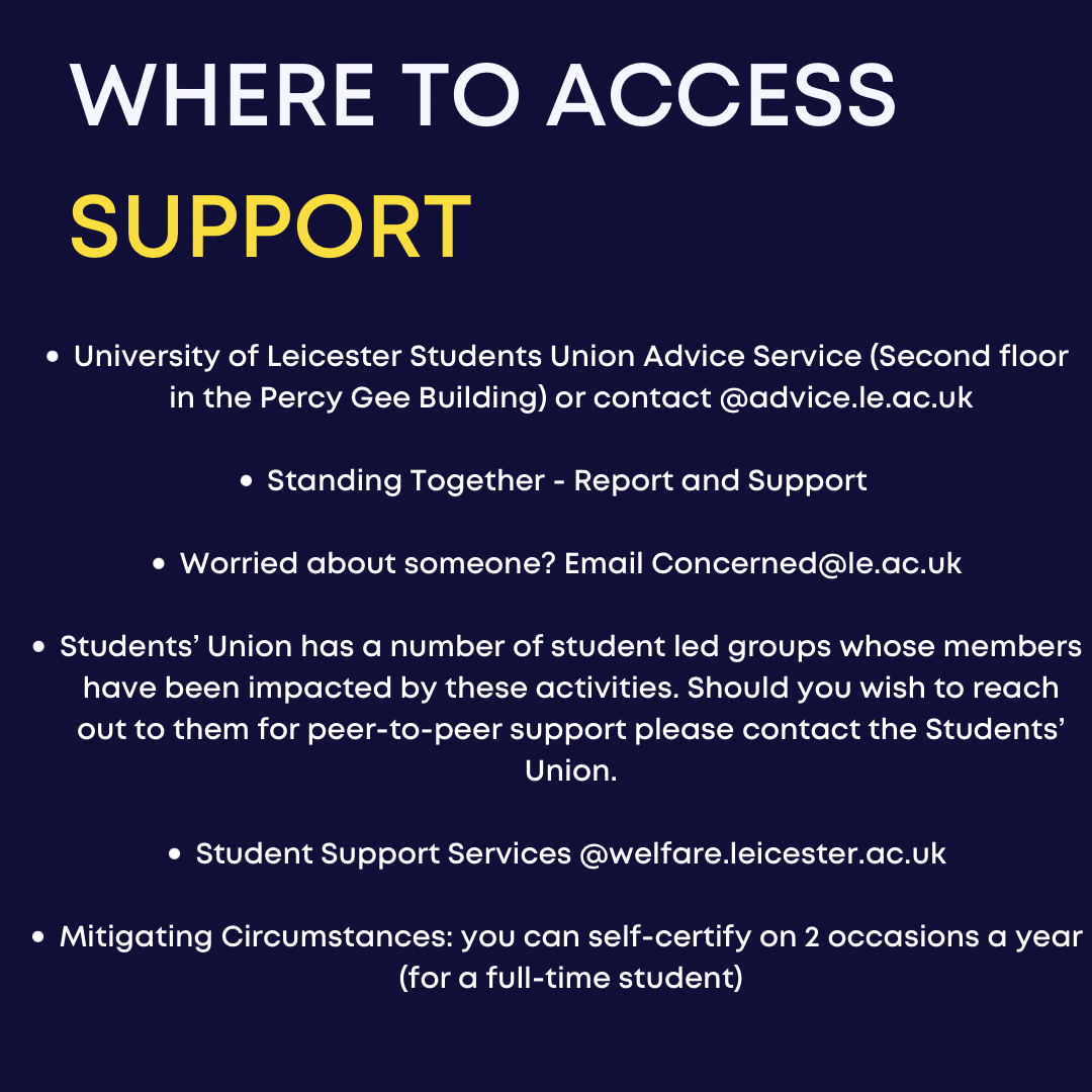 We want to address the recent events that have taken place between Israel and Palestine, and the implications this has had on our students. These events have and sadly will continue to cause emotional and mental distress to those students affected. As a Students’ Union, we are here to support all of our students, regardless of who they are and where they come from, and we will continue to do our best in supporting those students who have been affected by the ongoing conflict.