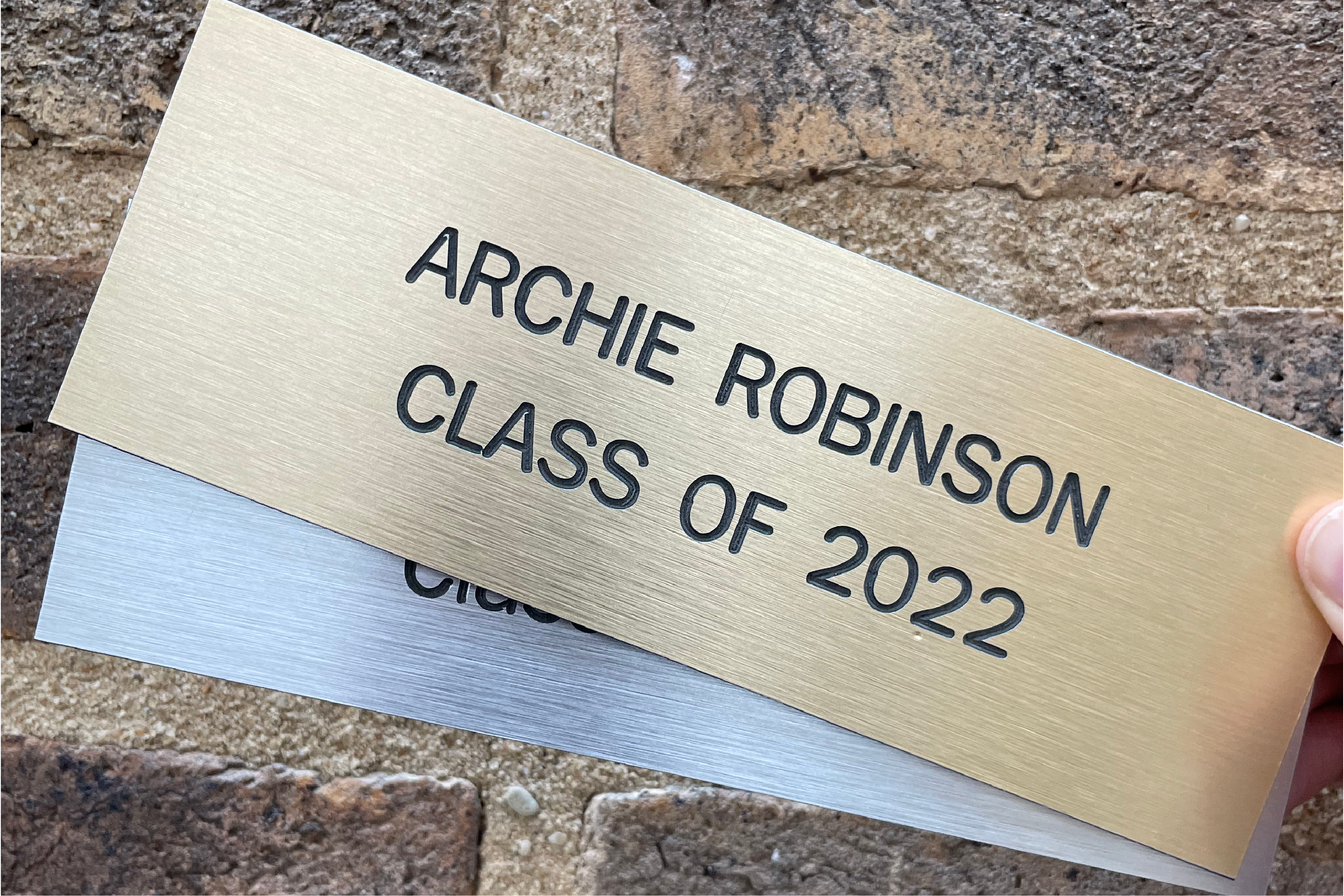 - Gold engraved plaque on brick